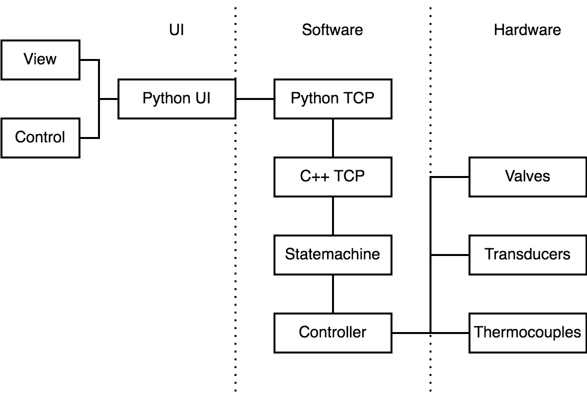 Ich leitete in den Jahren 2019 und 2020 die Softwareentwicklüng des Steuercomputers. Wir bauten einen Prüfstand zur Entwicklung des gesamten Systems. Der Prüfstand enthält die zwei hochgedruckten Brennungsflüssigkeiten, eine Menge von Ventile und den Steuercomputer.