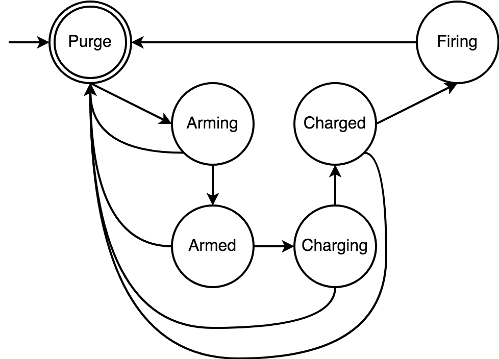 Der logische Unterbau des Steuercomputers wurde als eine Zustandsmachine zusammengebaut. Die Rakete tritt von einem Zustand zu dem nächsten, um eine Sendung zu versuchen.